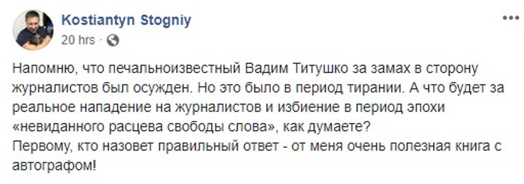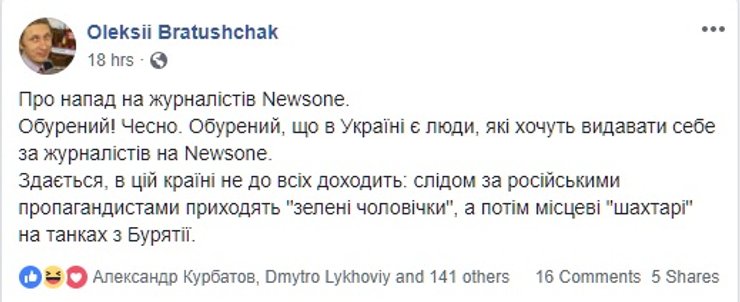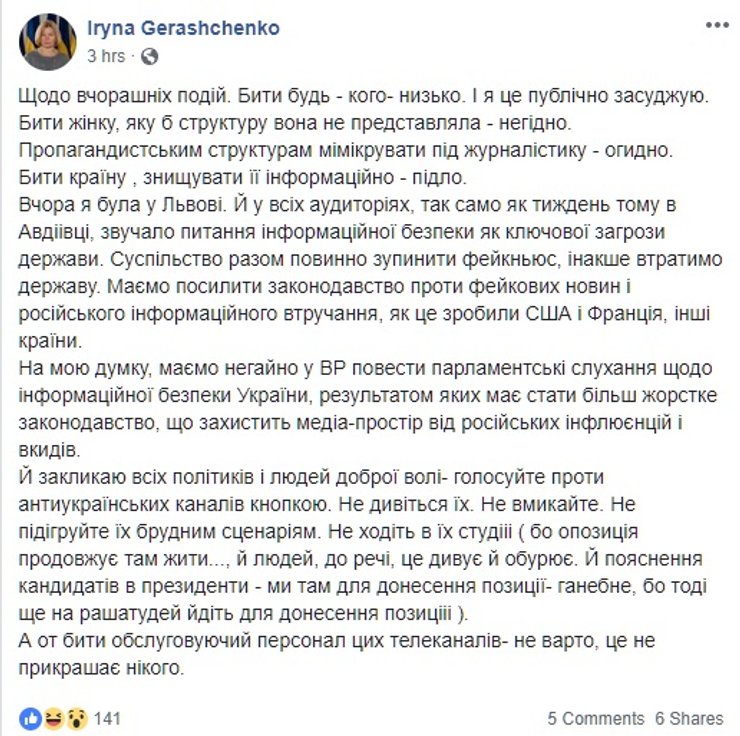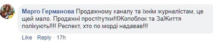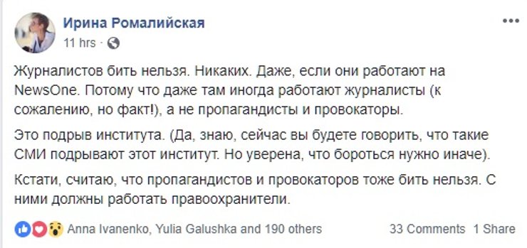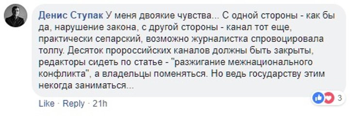 Но есть и те, кто считает, что бить журналистов все-таки нельзя, на какой бы канал они не работали. Но политику канала осуждают. Среди них Мустафа Найем (член депутатской фракции Партии "Блок Петра Порошенко"), который написал в Facebook, что если не нравится телеканал и вы считаете его деятельность антигосударственной то "есть соответствующие органы, в которые можно обратиться с фактами нарушения закона; не нравится собственник - та же история. Корень зла - там. А бить журналиста - это слабость и глупость".