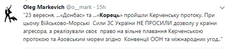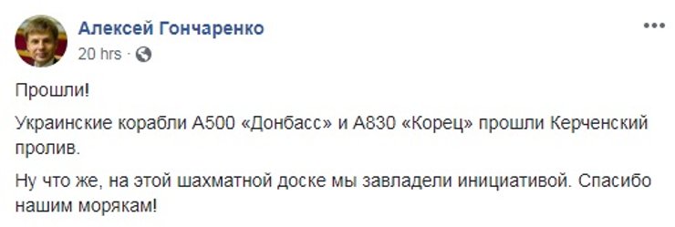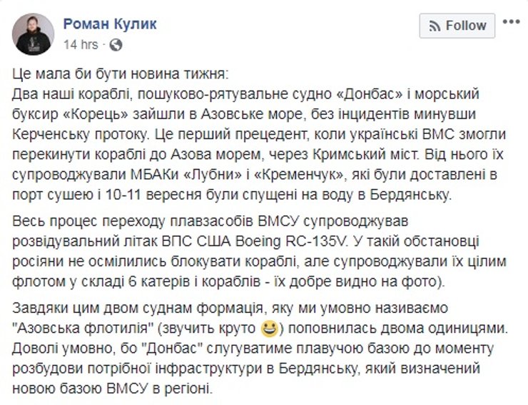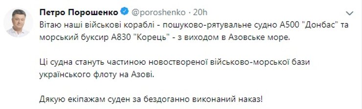 Украинское поисково-спасательное судно A500 "Донбасс" и морской буксир A830 "Корец" совершили переход из Черного моря в Азовское 23 сентября. Керченский пролив сейчас контролируется РФ. Но в соответствии с договором 2003 года Азовское море – это внутреннее море двух держав. Соответственно гражданские и военные суда под флагами Украины и РФ могут беспрепятственно заходить через пролив и следовать дальше в свои порты.