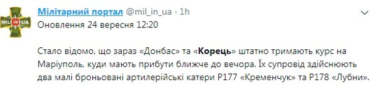 Сейчас "Корец" и "Донбасс" уже в Азовском море. Когда прибудут в Бердянск – точно не известно.