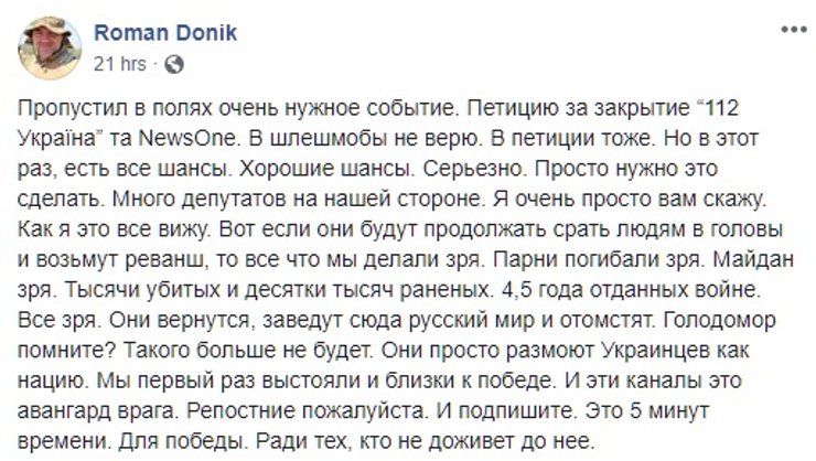 Судя по тому, как быстро идет сбор подписей, инициатива нашла последователей. Напомним, канал "112 Украина" летом 2018 года сменил собственника. Официально им является некто Эдуард Катц, гражданин Германии. Но если верить расследованию "Радио Свобода", то нынешним собственником канала является Виктор Медведчук.