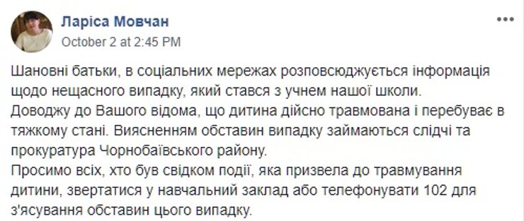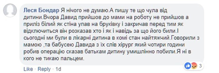 О происшествии стало известно после поста в Facebook. Жительница поселка Чернобай в Черкасской области Леся Бондарь написала, что третьеклассник Давид Лавриненко пришел к матери на работу, рассказал, что его избили одноклассники, и потерял сознание.