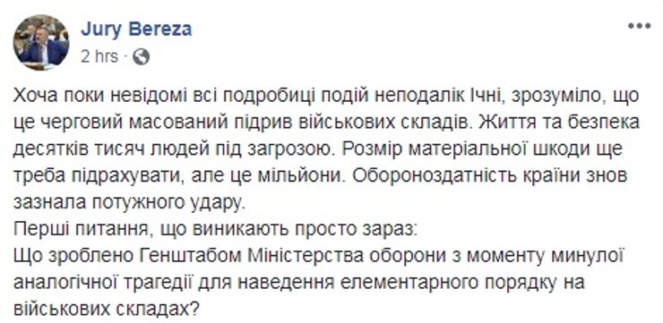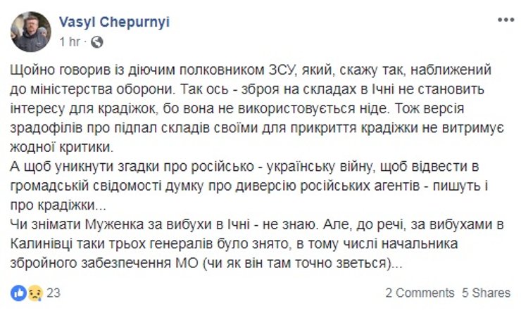Журналист Юрий Бутусов считает, что это была диверсия, а никак не попытка скрыть расхищение снарядов (такая версия озвучивалась в Сети). "Ичня ближе всего к РФ, туда беспилотник так же долетит, как долетел до Балаклеи. Так что не воровство это, это нападение", - пишет Бутусов у себя на Facebook.