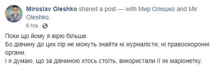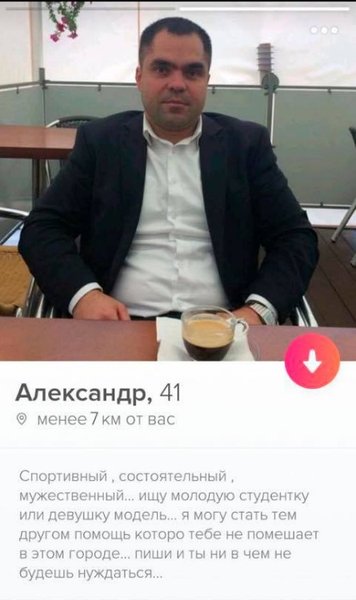 Однако если девушка, как заявил Геращенко, действительно получала угрозы, то логические нестыковки в ее посте можно списать разве что на волнение или желание скрыть какую-то информацию о себе. В конце концов в аккаунте на Tinder, с которым общалась девушка, все было описано кристально ясно: состоятельный мужчина ищет молодую студентку или модель (...) пиши, и ты ни в чем не будешь нуждаться.
