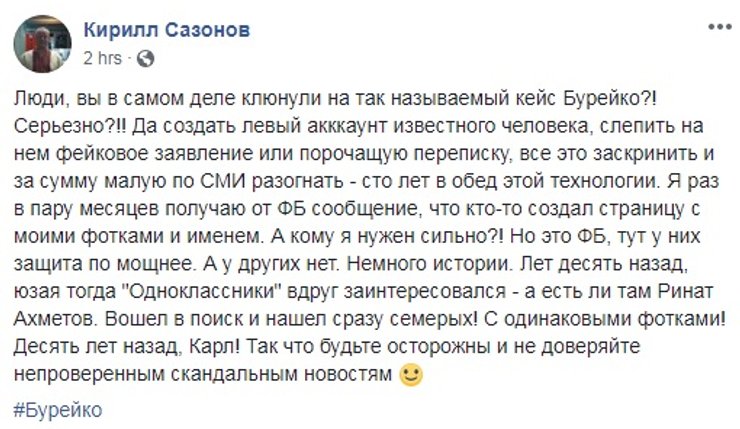 Вечером 8 ноября Бурейко отреклась от обвинений в адрес Варченко. Она написала в Facebook, что "стала жертвой циничной провокации против Александра и его супруги", а предыдущие посты удалила.
