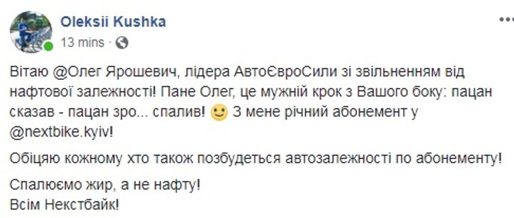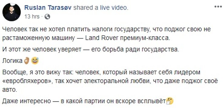 "Когда я заявил на нашей акции про то, что сожгу свой Land Rover, если не проголосуют нашу поправку – это не был популизм, или пиар!.. Для большинства людей, которые купили право использования авто европейской регистрации за 1500 евро, дешевле сжечь свое авто, нежели его купить и растаможить, согласно принятого сегодня закона", - заявил Ярошевич перед тем как поджечь машину.