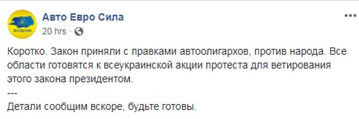 В "Авто Евро Силе" заявили, что все области готовятся к всеукраинской акции протеста для ветирования этого закона президентом, - так говорится в Facebook организации. Но когда именно она произойдет и в чем будет заключаться - неизвестно.