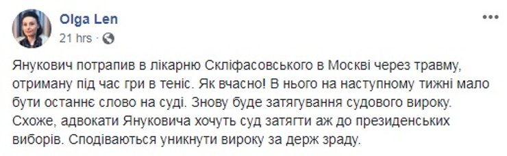 Внезапная травма, возможно, не вызвала бы большого удивления, не совпав она во времени с последним словом Януковича в Оболонском райсуде Киева по делу о его госизмене. Юристы экс-президента немедленно заявили, что их подзащитный выступить не сможет.