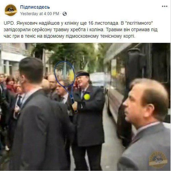 16 ноября с президентом-беглецом Виктором Януковичем приключилась незадача. Во время игры в теннис он получил серьезную травму (по данным СМИ - колена и позвоночника) и в "обездвиженном состоянии" был госпитализирован в НИИ имени Склифосовского. На следующий день Янукович отправился долечиваться в неназванную частную клинику, где находится и поныне.