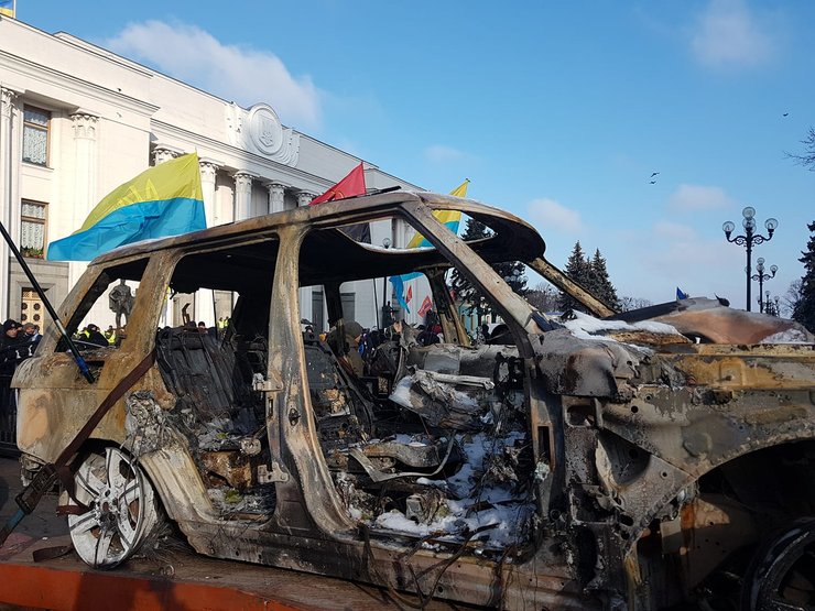 Первый масштабный протест "евробляхеры" устроили еще 9 ноября, когда и были приняты законы. Тогда лидер движения "Авто Евро Сила" Олег Ярошевич в знак протеста сжег свой Land Rover. И транслировал уничтожение машины в Facebook. Сегодня остов автомобиля привезли на эвакуаторе под стены Верховной Рады.
