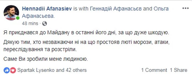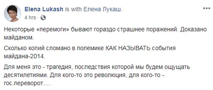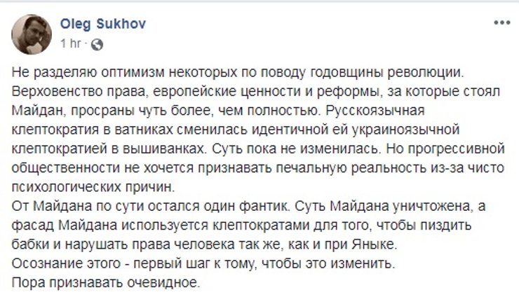 Похожего мнения придерживаются и многие другие непосредственные участники событий Евромайдана, которые высоко оценивают его идеалы и героизм людей, но критикуют пришедших к власти политиков.