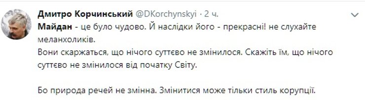 "Все, что больше - должно сделать государство, которое мы утратили в 2014-м, и которое пытаемся выстроить на обломках власти. Государство, в котором власть фрагментирована, где правят феодальные правила, которое запутано хаосом личных отношений, нелепых и отживших привычек, противоречивых и неграмотных законов. В этом хаосе постепенно выстраивается система", - написал он в соцсети.