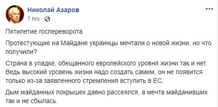 Некоторые посчитали, что Майдан ничего хорошего с собой не принес. В большинстве своем это те, кто изначально был против революционных изменений. Как, например, бывший премьер-министр Николай Азаров. Или его ближайшие соратники по политическому курсу. В принципе, было бы странно, если бы они высказались иначе, или нашли позитив в событиях кардинально изменивших их жизнь.