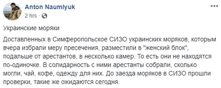 Сейчас украинским морякам уже передали в СИЗО предметы первой необходимости. Перед этим морякам помогли в самом СИЗО.
