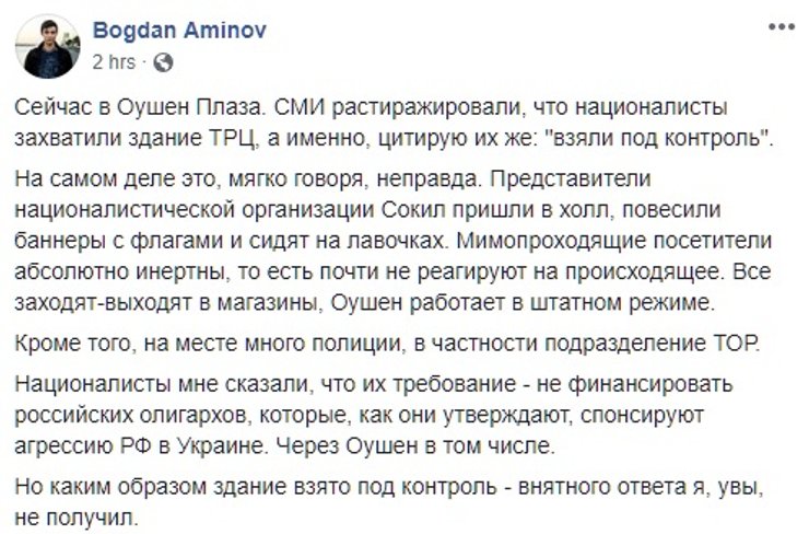 Сами участники акции говорят, что работу магазинов они не блокируют. "Мы требуем не платить аренду. Основное требование националистов -- прекратить финансирование терроризма и убийств украинских солдат за счет средств, которые выводятся из Украины через указанный Торговый центр. Вся дезинформация о захвате ТРЦ исходит от пророссийской администрации Ocean Plaza", -- заявил депутат киевского горсовета от ВО "Свобода" (и по совместительству глава киевской организации "Сокола") Владимир Назаренко .