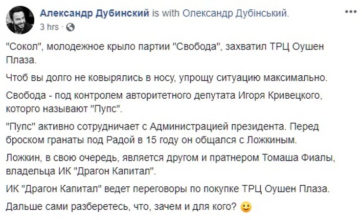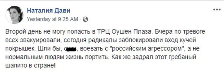 Это уже не первый раз, когда Ocean Plaza становится предметом пристального внимания националистов. Так, в июле 2018 года представители праворадикальной организации С14 оклеили попавшиеся им на пути поверхности стикерами, осуждающими присутствие российского бизнеса в Украине. И устроили перед входом митинг.