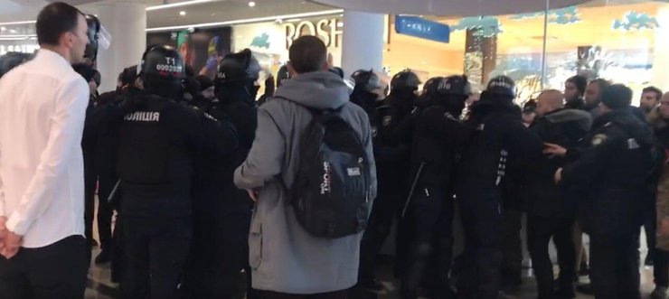 В ТРЦ днем было полно полицейских, но тогда задержали только одного участника акции -- депутата Черкасского горсовета от ВО "Свобода" и замглавы организации "Сокол" Ивана Косенко. При задержании якобы пострадала женщина, ее оттолкнул один из полицейских, и она упала.