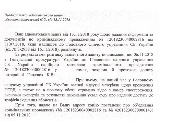 Во время заседания Юрий Луценко отметил, что дело Гандзюк постепенно продвигается. По его словам, следствие считает ключевой фигурой в организации нападения херсонского уголовного авторитета, ранее судимого Левина, который ранее уже был осужден вместе с отцом за организацию убийств и разбойных нападений на водителей в Херсонской области. Его отец получил пожизненный срок, а сын — 15 лет. Однако затем досрочно вышел по закону Савченко и сбежал из Украины, когда полиция задержала первых подозреваемых по делу. Луценко отметил, что правоохранители делают все, чтобы его задержать, не уточнив деталей и даже имени подозреваемого.