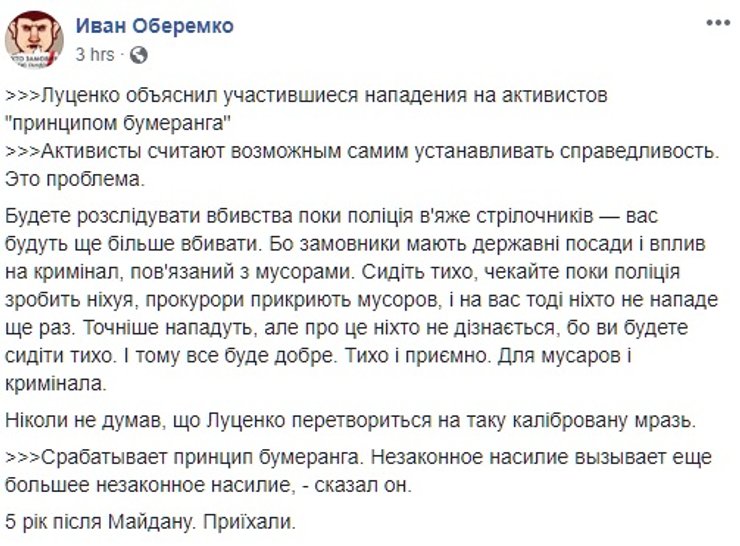 Юрий Луценко также рассказал, что перед заседанием виделся с Олегом Михайликом и Сергеем Стерненко. Напомним, на Михайлика напали у собственного дома 22 сентября и выстрелили ему в грудь. На Стерненко первый раз напали 1 мая, выстрелив в него из травматического оружия. А 24 мая на активиста напали двое мужчин, одного из которых Стерненко убил ножом, а другого — тяжело ранил. Теперь, по словам Луценко, его дело объединили с нападением на двух одесских активистов Кузаконю и Козьму. В их машину 2 августа на полной скорости врезался грузовик.