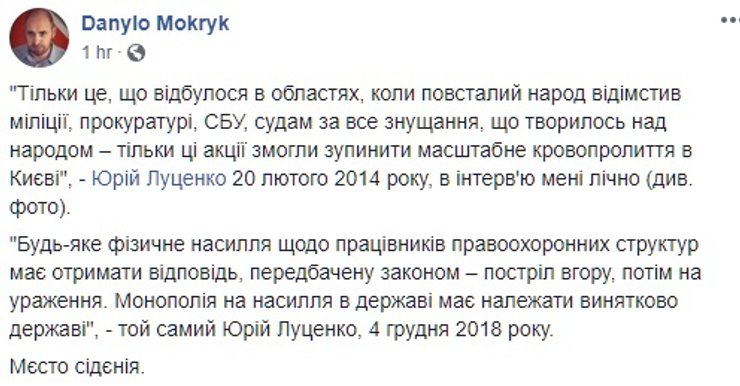"Если "активисты" или другие лица будут нападать на правоохранителей во время военного положения, нужно разрешить силовикам делать предупредительный выстрел, а затем стрелять на поражение", — сказал генеральный прокурор и вызвал еще один всплеск негодования в социальных сетях. Ведь еще в феврале 2014 года Юрий Луценко оценивал активное сопротивление правоохранительным органам несколько иначе.