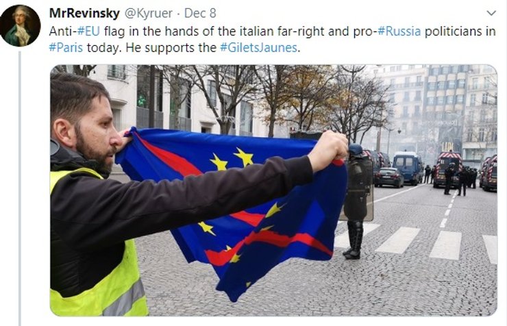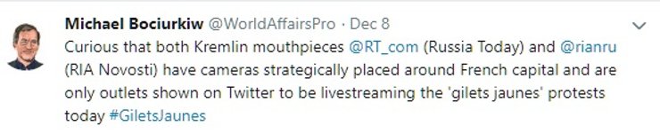 "Альянс по защите демократии" (подразделение Германского Фонда Маршалла США, которое следит за российскими Twitter-аккаунтами) выяснил, что около 600 аккаунтов в соцсети, которые были замечены в "пропаганде взглядов Кремля", переключили свое внимание на Францию, публикуя посты с хэштегом #giletsjaunes.