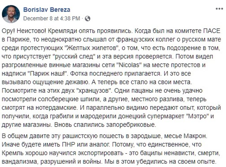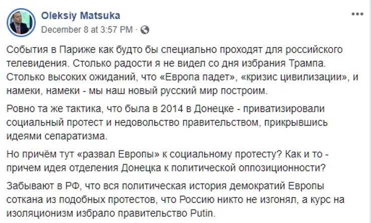 А пока в соцсетях выясняют, есть ли российский след во французских митингах, французские спецслужбы начали расследование о влиянии России на "желтых жилетов".