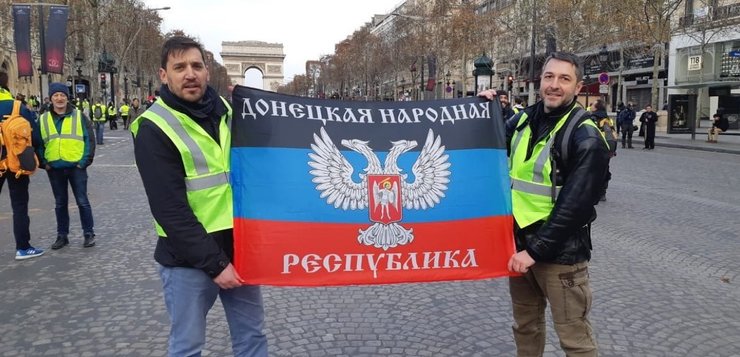 Личности двух мужчин с флагом в СБУ выяснили. По данным украинской спецслужбы, это Сорлин Фабрис - функционер так называемого "интеграционного комитета" Россия – Донбасс. Справа - Ксавье Моро, который был "наблюдателем" на псевдовыборах в ОРДЛО. В течение 17 лет проживает в РФ, гражданин РФ с 2013 года. Функционер ОО "Восток Франция – Солидарность Донбасс".