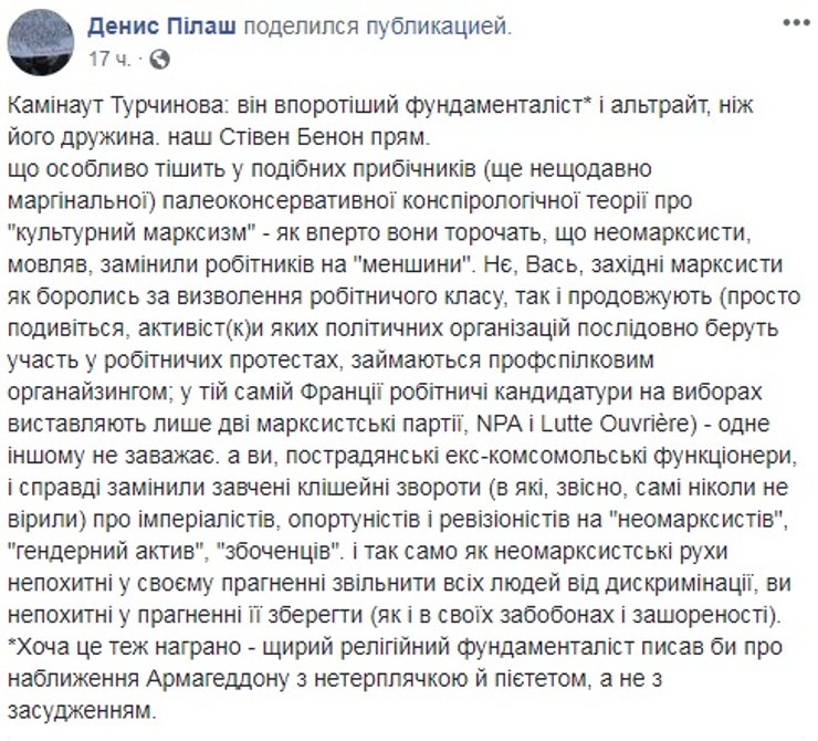 "В современных условиях неомарксизм предлагает обществу борьбу за права новых "угнетенных", назначая их на роль эмансипированных женщин, гомосексуалистов, лесбиянок, трансгендеров и тому подобных", – пишет Турчинов.