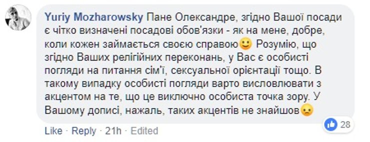 Турчинов в свою очередь выступил с публичной поддержкой обращения Ивано-Франковского облсовета, а позицию Левченко назвал "неадекватной" и "агрессивной". Кроме того, он высказал свой собственный взгляд на проблему защиты семейных ценностей и гендерного вопроса в Украине.