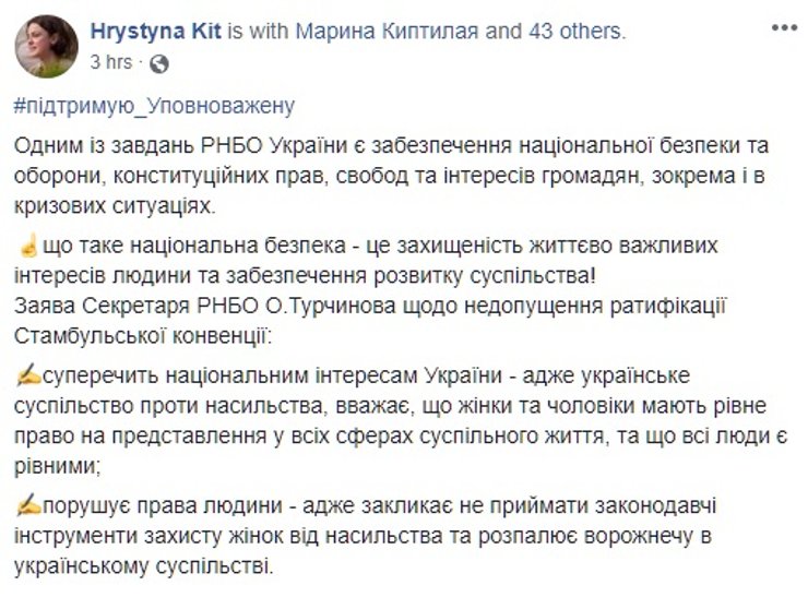 11 декабря секретарь Совета национальной безопасности и обороны Украины Александр Турчинов опубликовал на своем сайте статью под названием "Неомарксизм или путешествие в бездну", в которой назвал борьбу за права секс-меньшинств "неомарксизмом", а Стамбульскую конвенцию о борьбе с насилием в отношении женщин "манифестом гендерной идеологии".