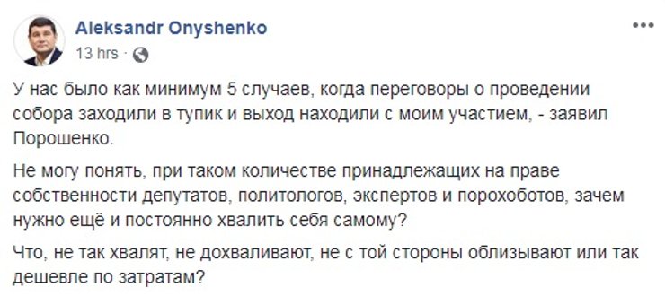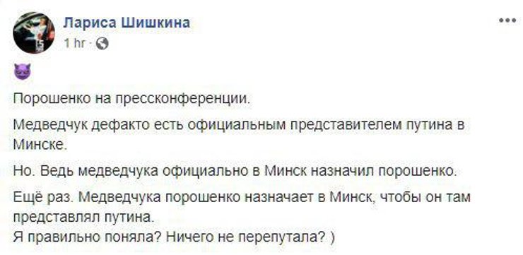 "Де-факто Медведчук — представитель Путина на этих переговорах и является, возможно, единственным источником, каналом для донесения информации. Если стоит вопрос перед президентом Порошенко, что он должен встречаться и готовить любые предложения, которые помогут вернуть наших парней и девушек домой, я буду это делать и буду встречаться", — заявил президент.