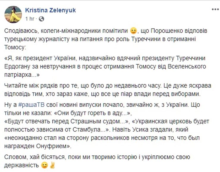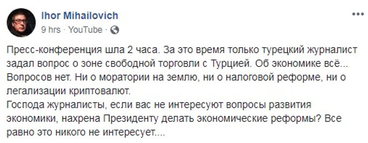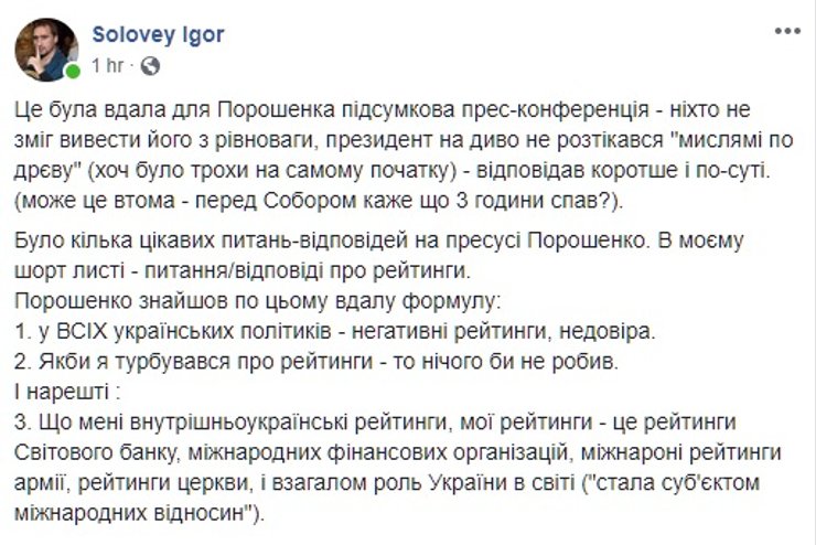 С подачи пресс-секретаря президента, первыми разрешили задать вопросы, касающиеся вопросов религии. Президент рассказал, что Объединительный собор был проведен абсолютно образцово, но признался, что переговоры по его организации как минимум пять раз заходили в тупик. А выходили из тупика благодаря его, Петра Порошенко, дипломатическим талантам.