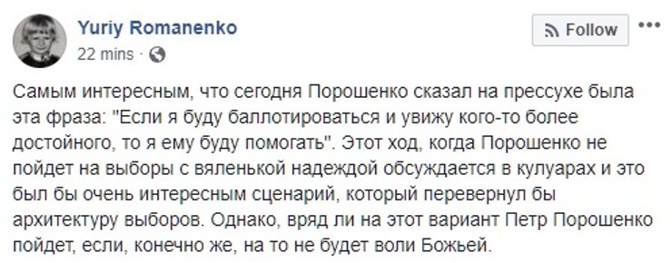 Отвечая на вопросы, президент коснулся и своего политического будущего. По словам Петра Порошенко, он еще не готов объявить о том, будет ли баллотироваться в марте 2019 года. Кроме того, в случае своего неучастия в выборах президент готов помогать "кому-то более достойному". Тем не менее, отвечая на вопрос об оппонентах, Порошенко отметил, что оппонентов у него нет. "Я являюсь президентом Украины. Они пока или лидеры фракций, или общественные деятели, которые проводят свои кампании. Это их право. Я их своими оппонентами по состоянию на сейчас не считаю", — объяснил Порошенко.