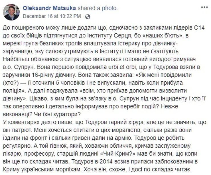 Публичное противостояние украинского хирурга с и.о. министра здравоохранения началось еще в начале 2017 года. Тогда Тодуров обвинил Супрун в халатности и срыве закупок материалов для кардиохирургии, после чего они с некоторой периодичностью продолжали обмениваться "любезностями". Впрочем, без какого-либо эффекта, пока в феврале 2018 года сам Институт не попал в центр скандала, когда в его детском отделении активисты ультранационалистической организации С14 обнаружили Юрия Крысина, обвиняемого в соучастии в убийстве журналиста газеты "Вести" Вячеслава Веремия и нападениях на участников Евромайдана. Тодуров тогда объяснял, что этого пациента направили в детское отделение из-за нехватки мест во взрослом, а в Минздраве намекнули на то, что таким образом Крысин пытается избежать правосудия, фактически повторив версию активистов.