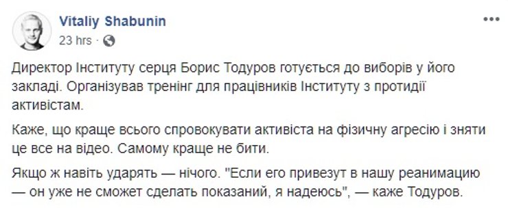 Выборы генерального директора в Институте сердца Министерства здравоохранения, на которых вчера победил известный хирург Борис Тодуров, не обошлись без скандалов. В ход пошли и "титушки", и "активисты", а стороны конфликта допустили ряд неоднозначных высказываний, которые не остались незамеченными в соцсетях