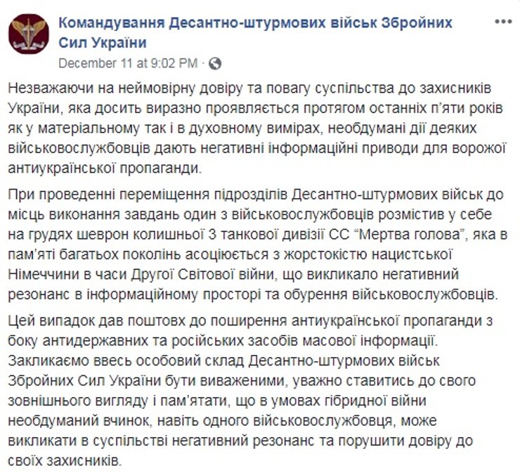 Командование десантно-штурмовых войск также принесло свои извинения, призвав военнослужащих не создавать поводов для антиукраинской пропаганды.