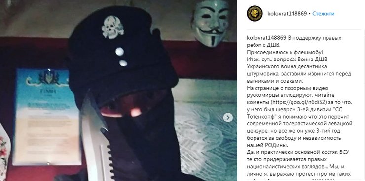 В соцсетях обсуждают флешмоб в поддержку бойца десантно-штурмовых войск, который попал в объективы фотокамер с эмблемой дивизии СС "Мертвая голова" на униформе во время визита в часть Петра Порошенко, а затем был вынужден принести извинения