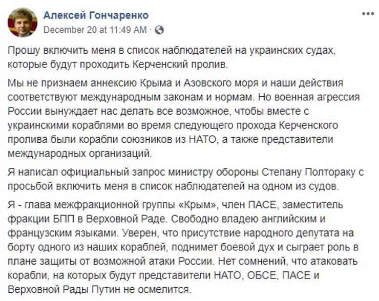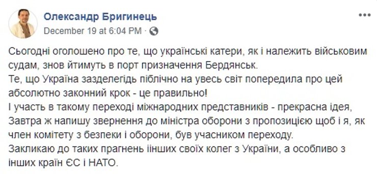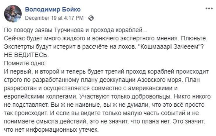 Секретарь СНБО Александр Турчинов анонсировал новый поход украинских кораблей из Черного моря в Азовское, а замминистра по вопросам оккупированных территорий Юрий Грымчак заговорил об участии в походе британского HMS Echo. В соцсетях эта инициатива вызвала смешанные оценки