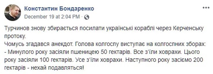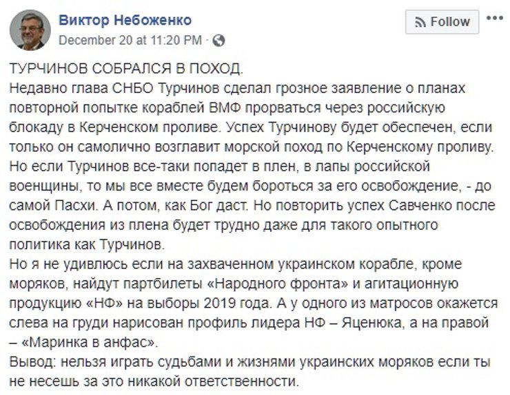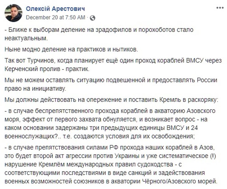 Сейчас в российском плену находятся украинские моряки, а в порту оккупированной Керчи пришвартованы три украинских корабля, которые российские военные захватили месяц назад неподалеку от Керченского пролива. И вот секретарь СНБО фактически анонсирует новый проход кораблей ВМС Украины под Керченским мостом. И объясняет, зачем это нужно. "Если мы остановимся и отступим, то Россия фактически выполнит свою задачу по захвату Азовского моря, предъявит миру определенные самостоятельно новые морские границы в Черном море, де-факто легализовав оккупацию Крыма", -- сообщил Турчинов.