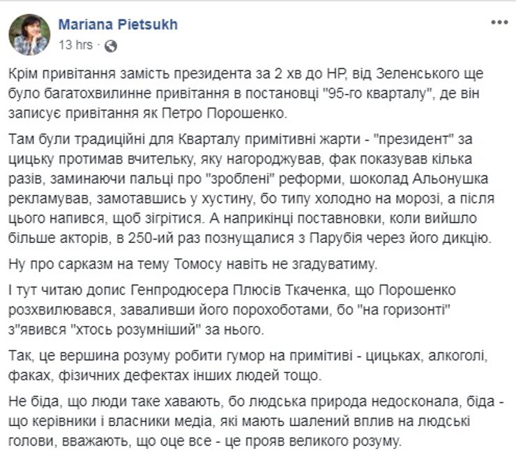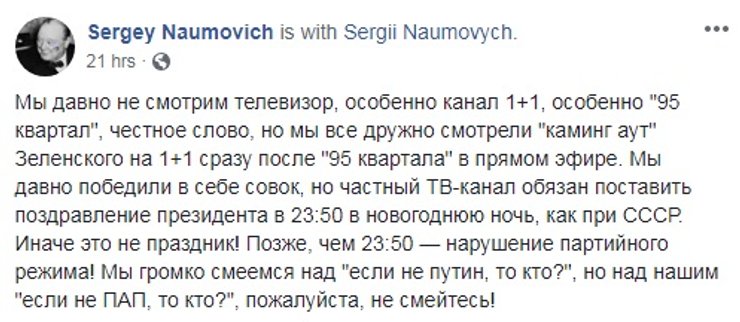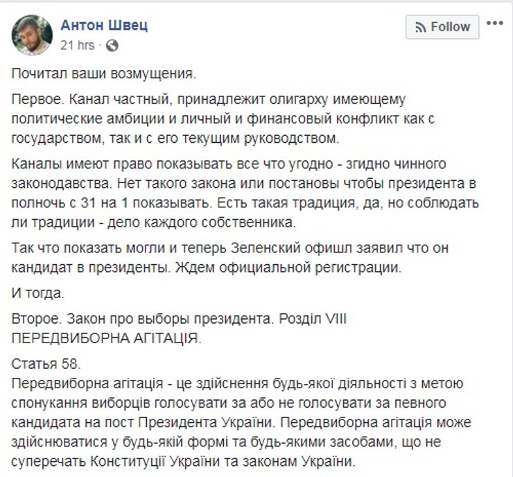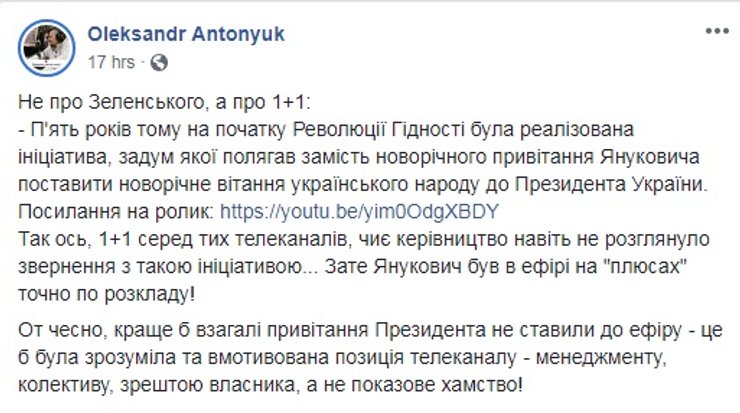 Владимир Зеленский выступил на телеканале "1+1"  в канун Нового года и заявил, что намерен баллотироваться в президенты, при этом выступление Порошенко показали уже после боя часов. В соцсетях нарушение традиции вызвало на удивление ожесточенные споры