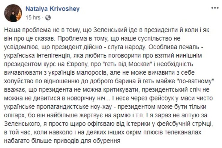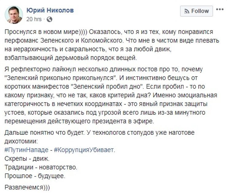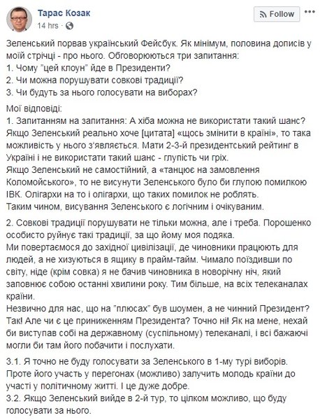 Однако предметом для баталий в соцсетях стала не только рокировка с новогодними поздравлениями, но и сам факт самовыдвижения Зеленского. Хотя в недавнем интервью он на это всячески намекал и сюрпризом это не стало. Аргументы сторон практически не поменялись.