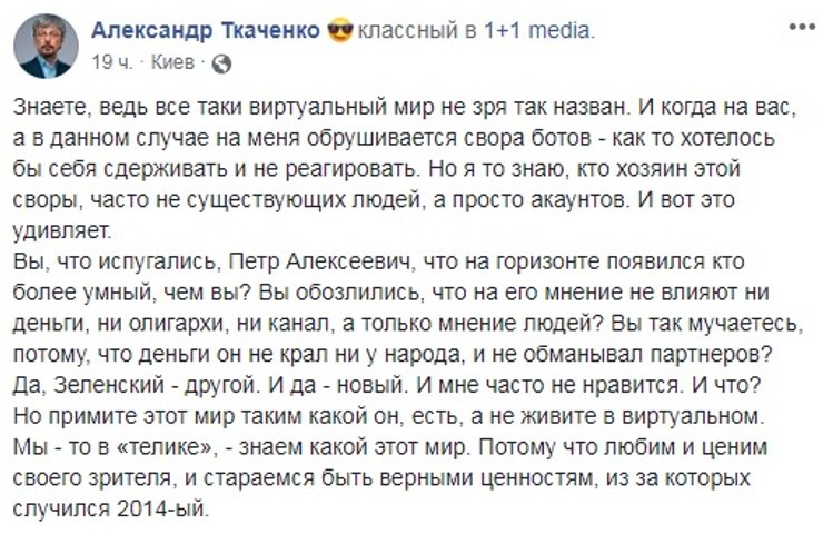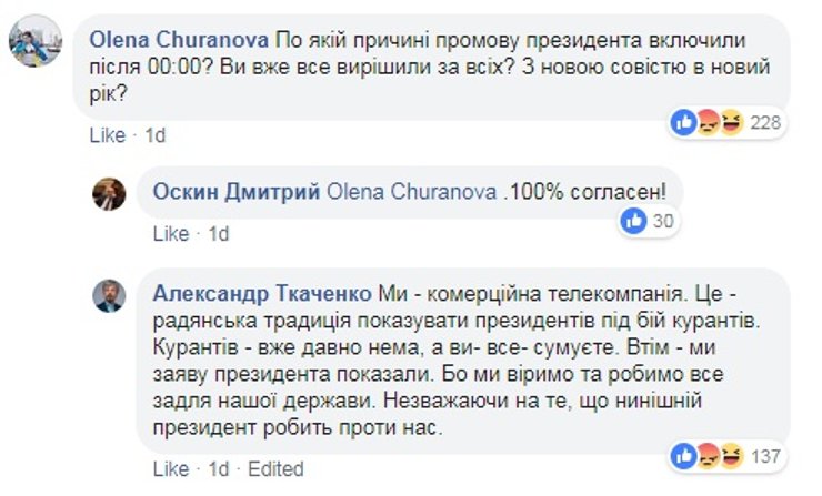 Генеральный директор "1+1" Александр Ткаченко оперативно отреагировал на критику и заявил, что коммерческий телеканал не обязан ставить обращение президента под бой курантов, а критиков назвал "сворой ботов", действующих по указке Петра Порошенко.