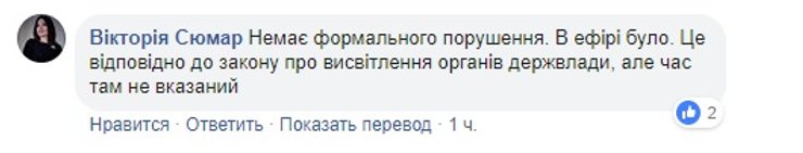 Самое интересное, что никакого нарушения не произошло. Телеканалы не обязаны показывать произносящего речь президента в какое-то определенное время. И это подтвердила глава Комитета Верховной рады по вопросам свободы слова, народный депутат от "Народного фронта" Виктория Сюмар.