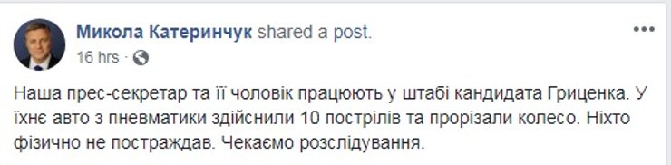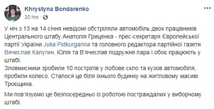 Глава пресс-службы кандидата в президенты Кристина Бондаренко официально заявила, что в машину выпустили десять пуль и порезали колесо. И обстрел машины связан именно с профессиональной деятельностью супругов. Подкурганная является пресс-секретарем Европейской партии Николая Катеринчука, который поддерживает на выборах Гриценко, ее муж Калугин работает главным редактором партийной газеты.