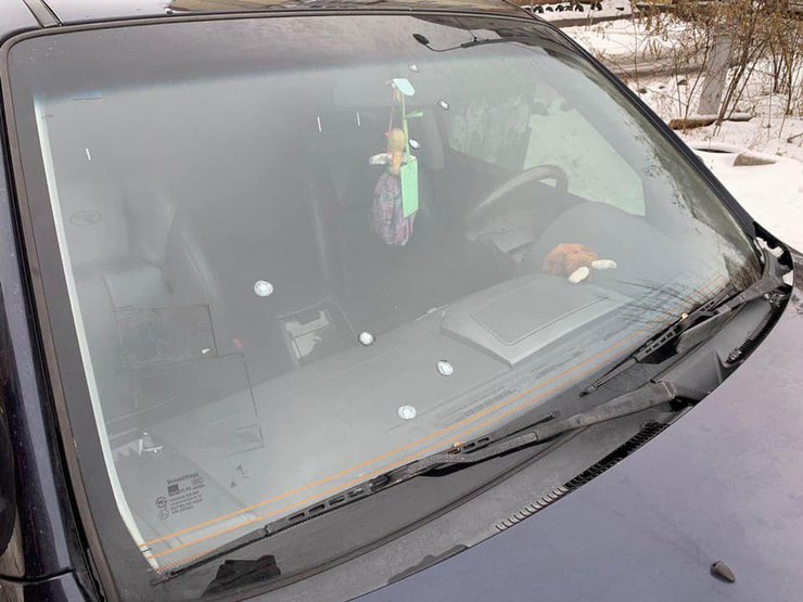 Правда, супруги-штабисты зачем-то оперативно сменили порезанное колесо еще до приезда полиции. Поэтому на фото в сети видно только следы на лобовом стекле автомобиля.