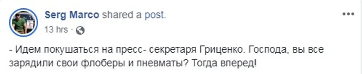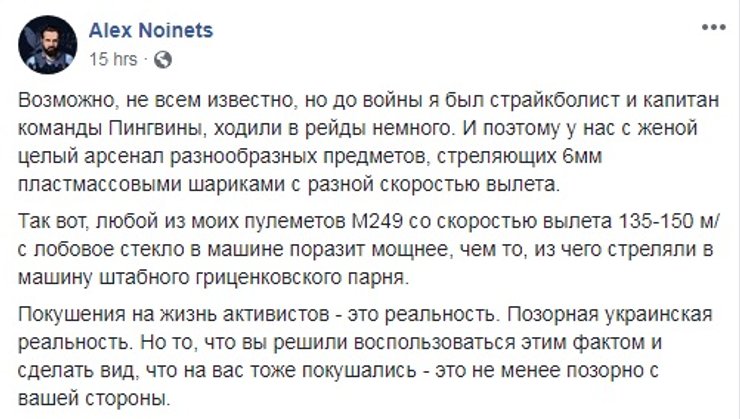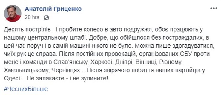Когда сам Анатолий Гриценко, его однопартийцы и сочувствующие убеждены, что это был именно акт запугивания и машину супругов испортили именно из-за их политических убеждений и работы.