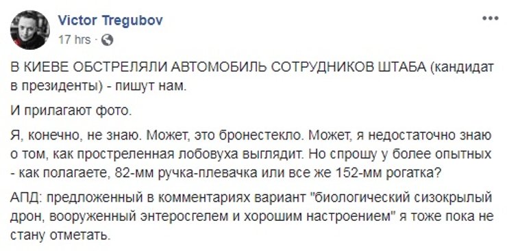 А кто-то даже обвинил самого кандидата в президенты в инсценировке и раздувании скандала из бытового, хоть и неприятного события. Ведь машины в Киеве портят довольно часто.