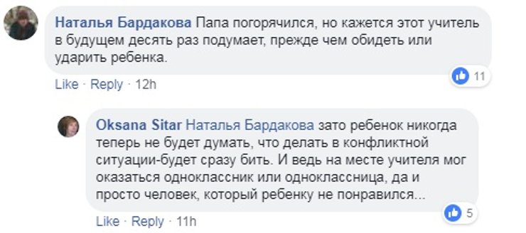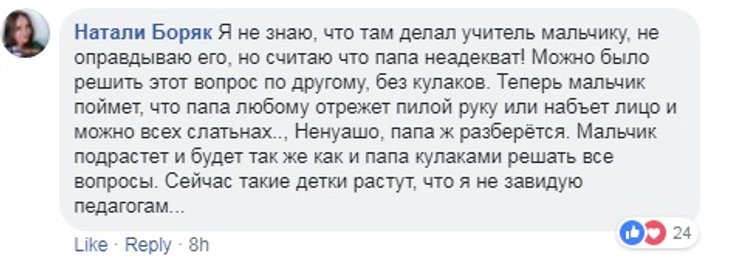 Родители, которые лично не знают участников конфликта, в своем большинстве сошлись на мнении, что кулаки ни в коем случае нельзя пускать в ход, и задались вопросом, как произошедшее повлияет на психику детей, которые были свидетелями избиения учителя.