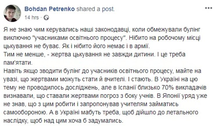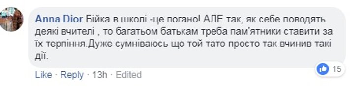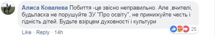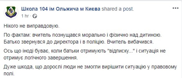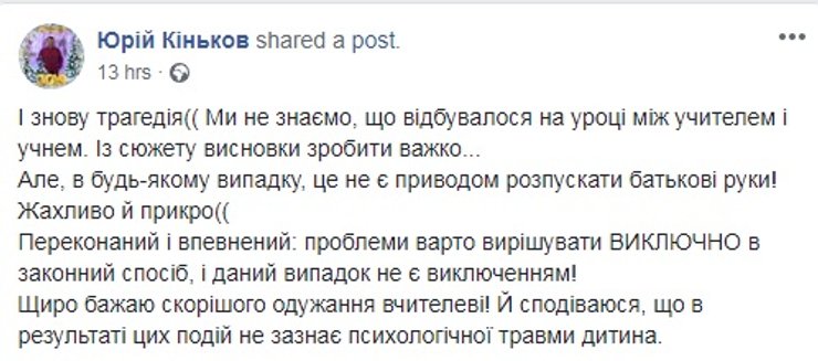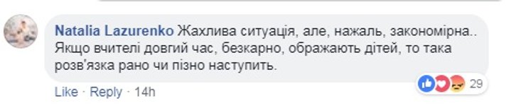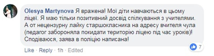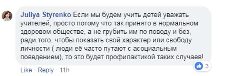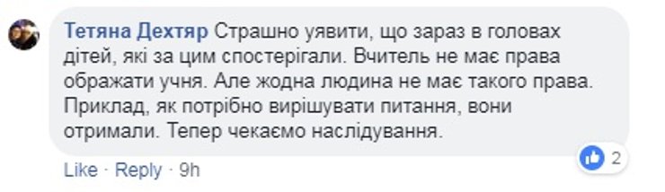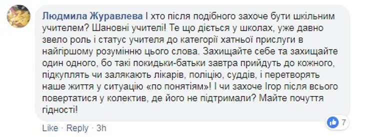 Киевская городская организация Профсоюза работников образования и науки Украины уже обнародовала заявление, в котором говорится о несправедливости при расследовании подобных инцидентов. "В случае конфликтов "учитель-ученик", "родители-учитель" в СМИ и соцсетях, на защиту учителя становятся только профсоюз, коллеги и некоторые родители. В обществе целенаправленно формируется идея, что учитель – это обслуживающий персонал и, вполне возможно, что именно такое отношение и есть одной из причин ряда преступлений против учителей", - говорится в заявлении.