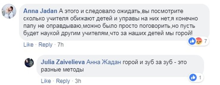 Отца журналистам расспросить не удалось. Но ситуация вызвала негодование и родителей, и учителей. Некоторые родители предполагают, что учитель превысил полномочия, накричав на ребенка, что и вывело отца из себя.
