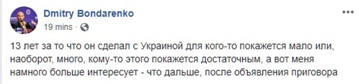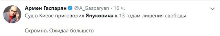 Другие посчитали 13 лет тюрьмы слишком мягким наказанием для Януковича. Напомним, что сторона обвинения просила для него 15 лет лишения свободы - максимально возможный срок по инкриминируемым ему статьям.